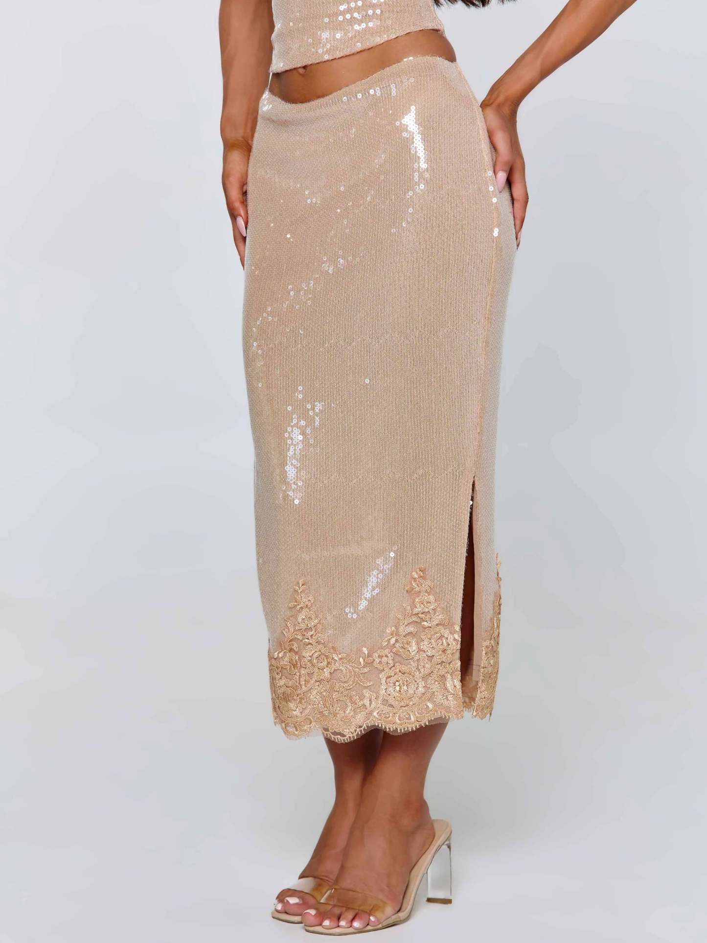 This matching beige sequin midi skirt features a body-hugging fit with lace-trimmed hem detailing. Designed to enhance curves, it pairs perfectly with the Sparkle Lace Corset Top for a complete party set.