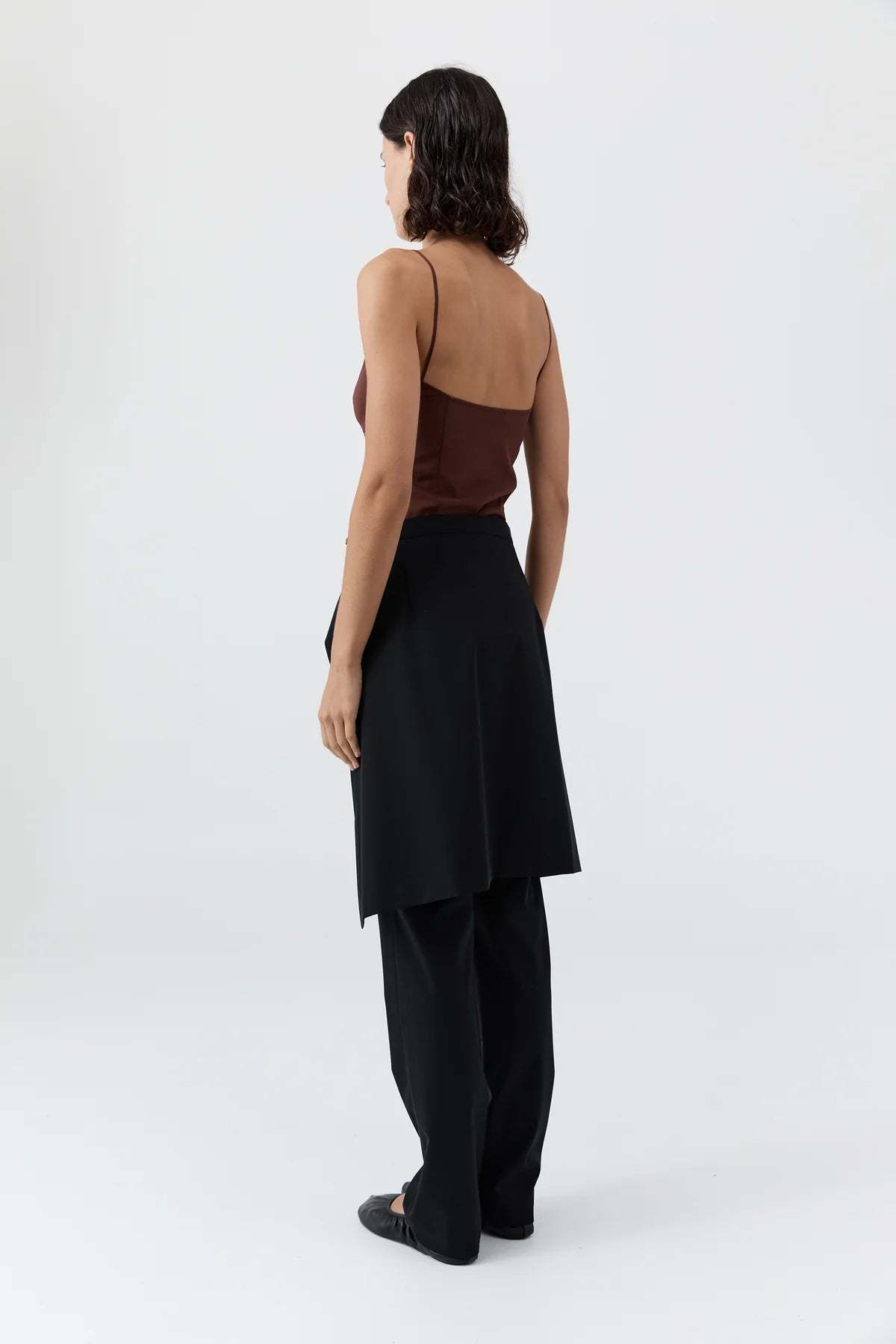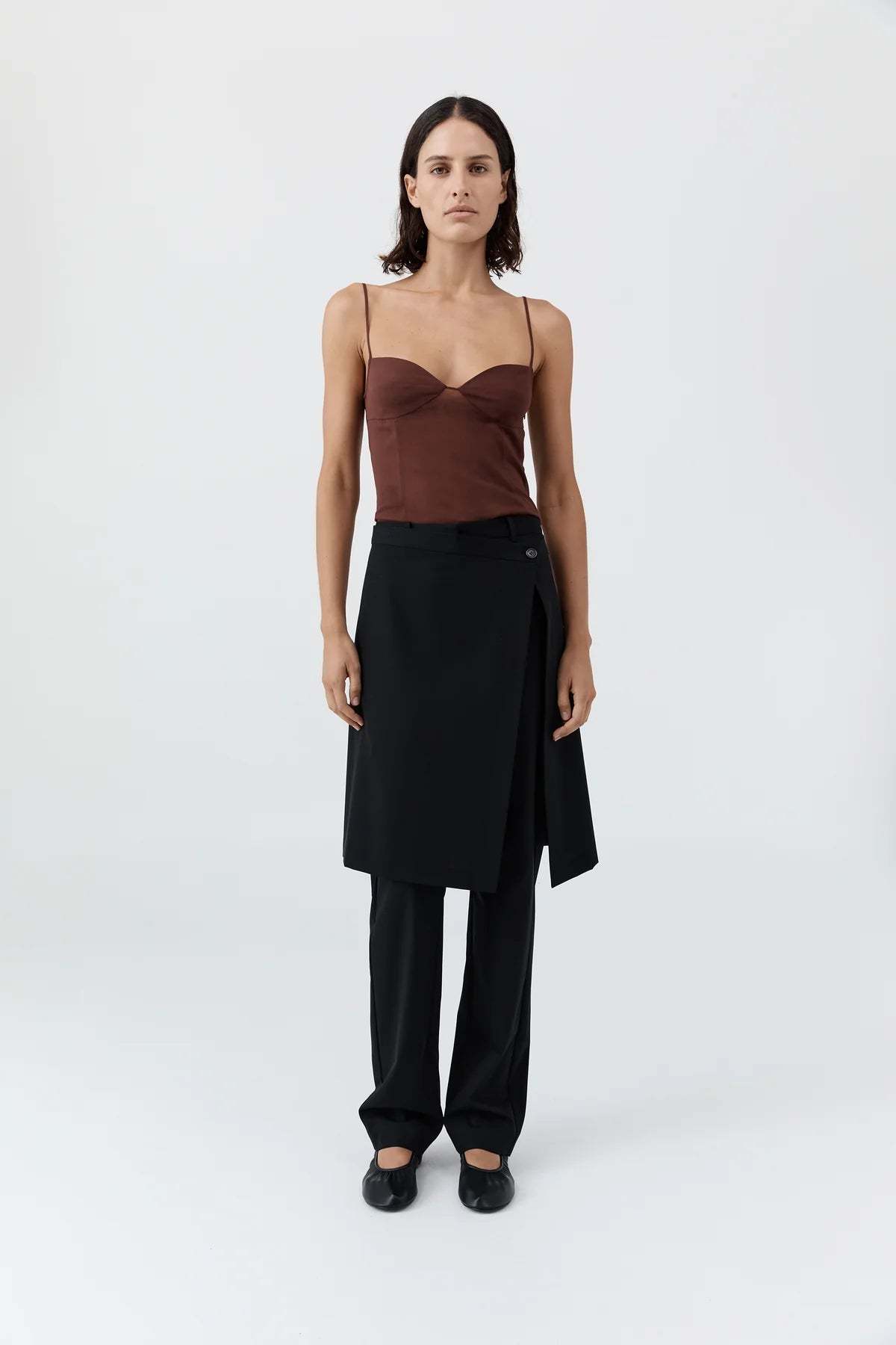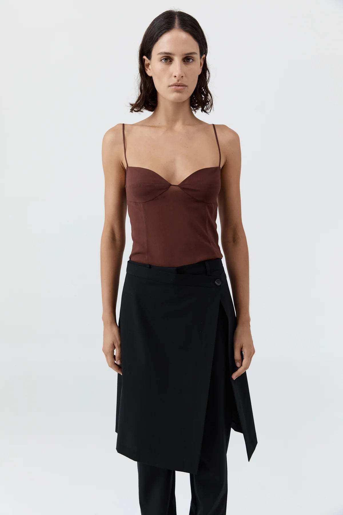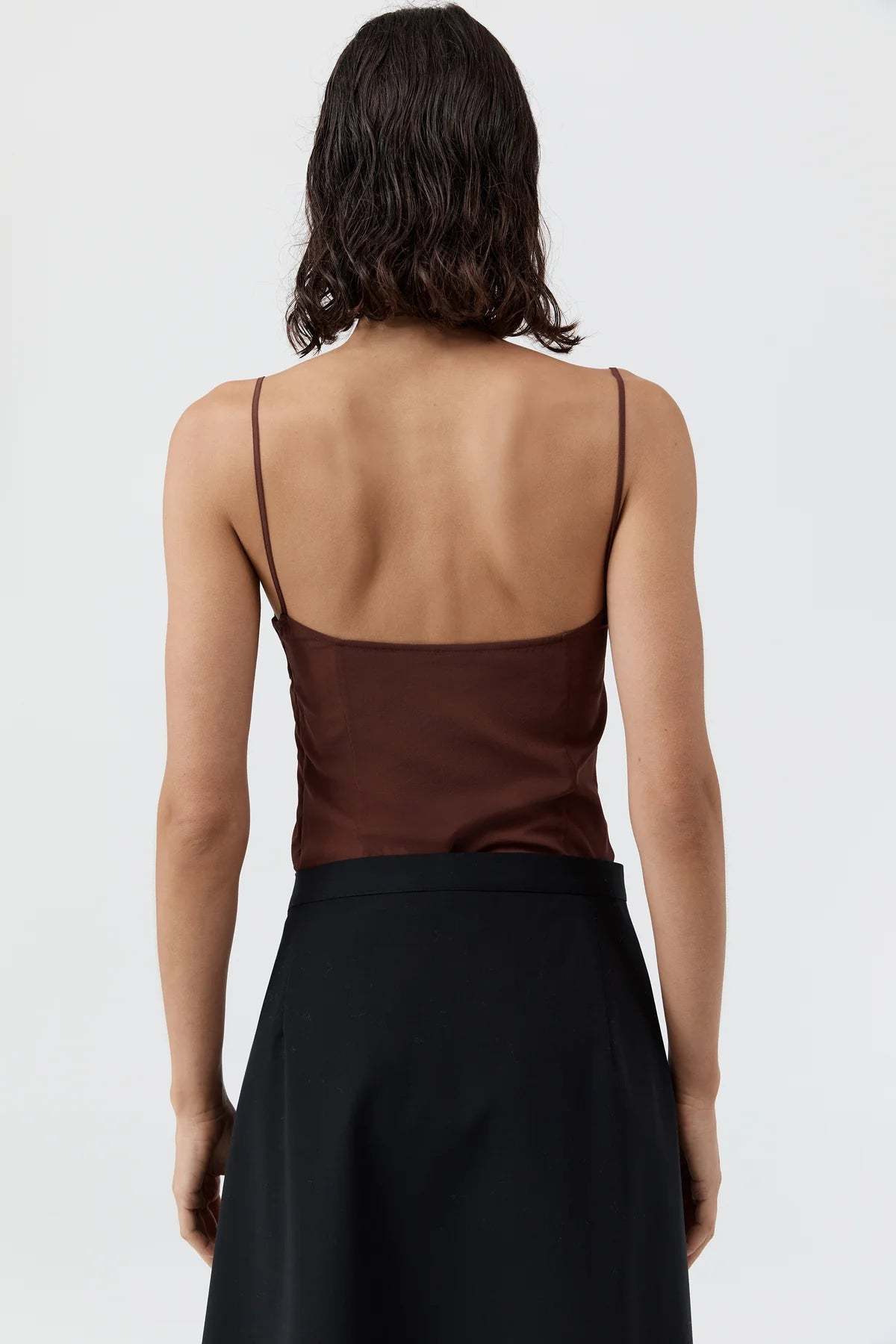 A sultry brown cami crop top crafted from semi-sheer fabric. Lightweight, minimal, and perfect for layering or bold styling.