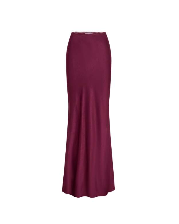 This burgundy satin maxi skirt features a fitted mermaid silhouette that enhances curves with a glossy finish. Designed to pair perfectly with the Burgundy Tie Muse Bralette for a striking evening set.