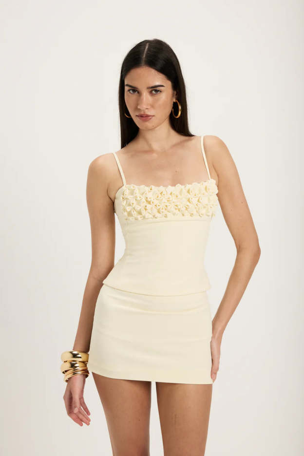 A romantic cami crop top featuring sculpted 3D floral appliqué at the bust. Soft, feminine, and statement-making.