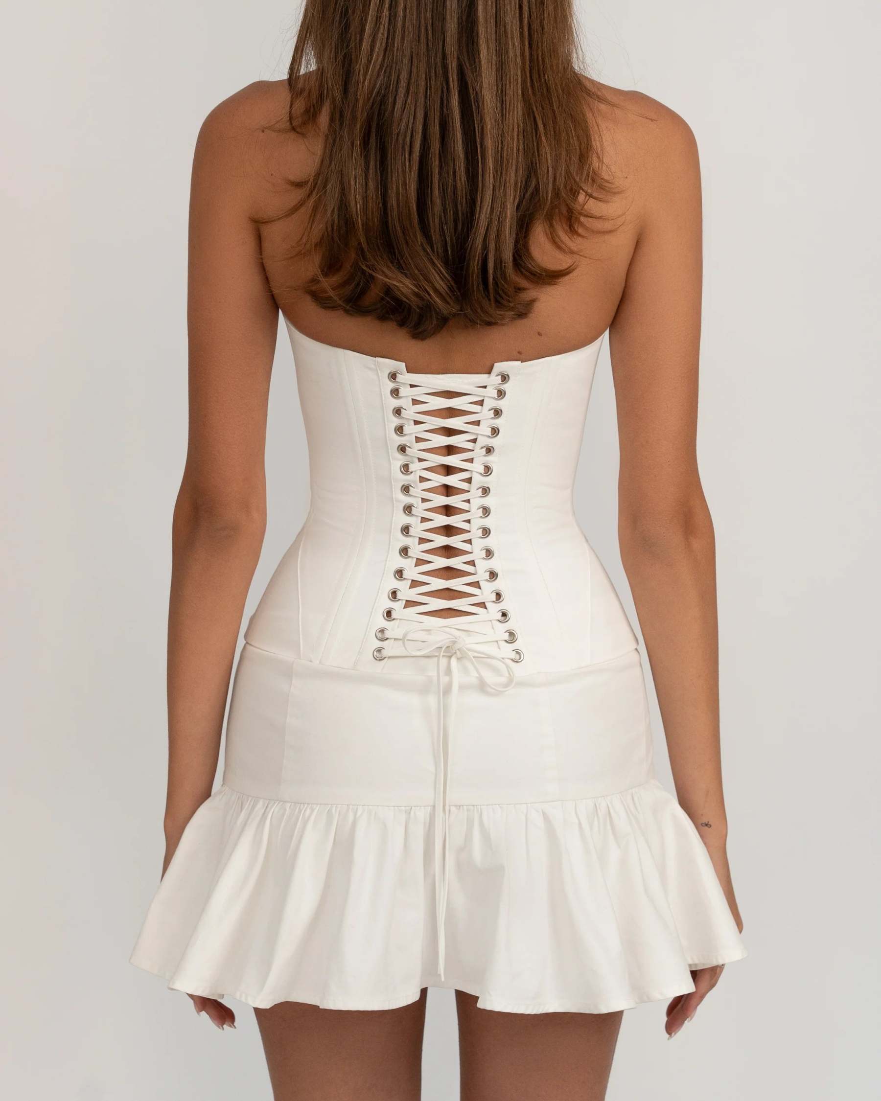 Clean lines with adjustable shaping. This strapless white corset top features a structured bodice and lace-up back, allowing a customized fit that highlights the waist and neckline.