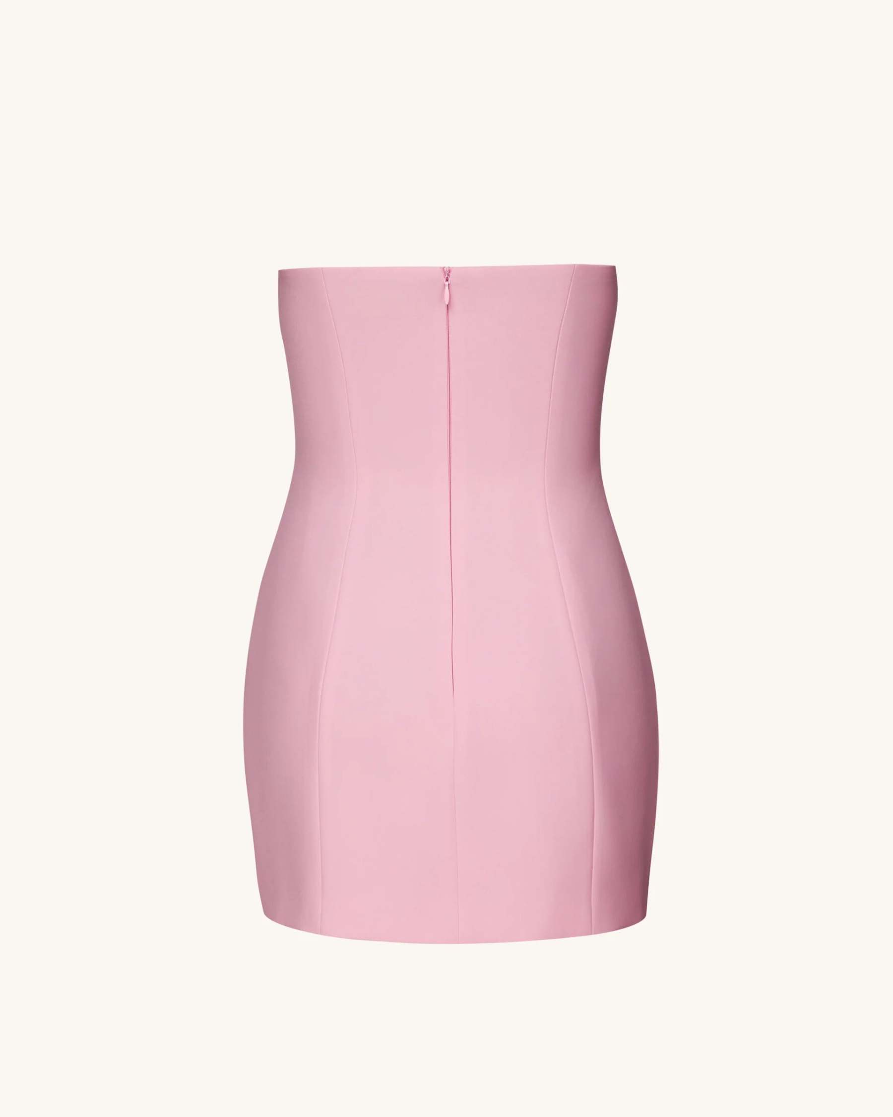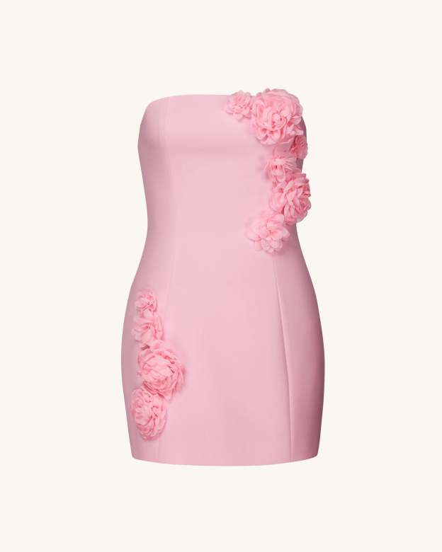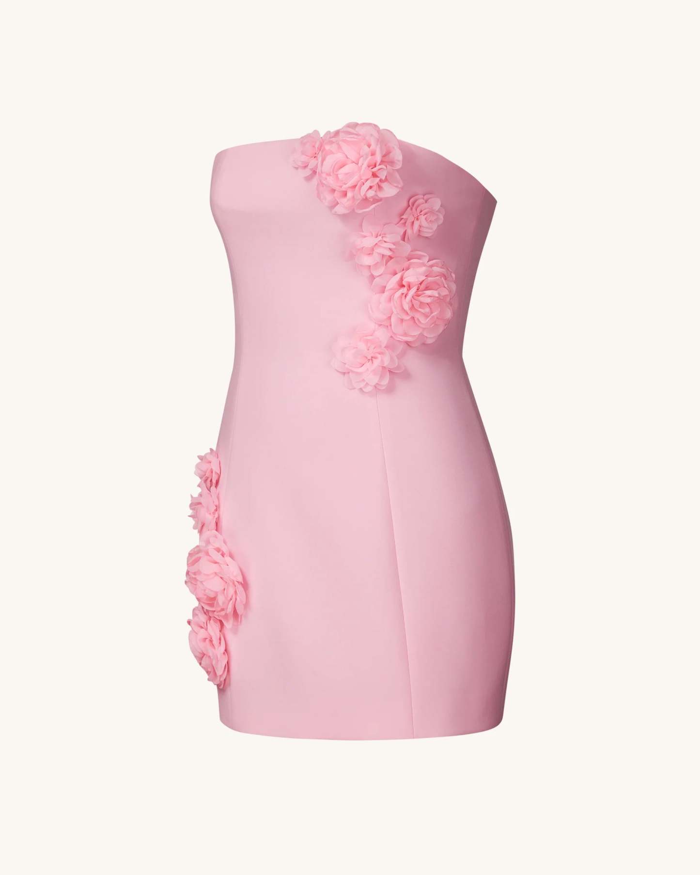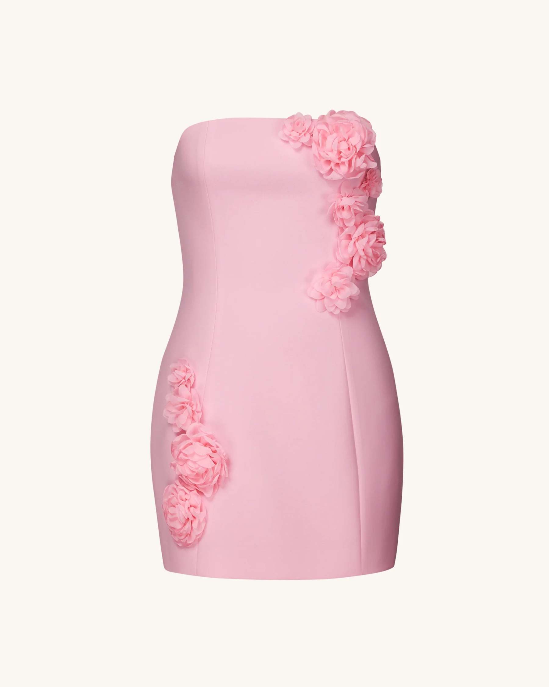 A playful strapless mini dress with a cinched waist and sculpted 3D floral appliqués. Sweet, flirty, and eye-catching.