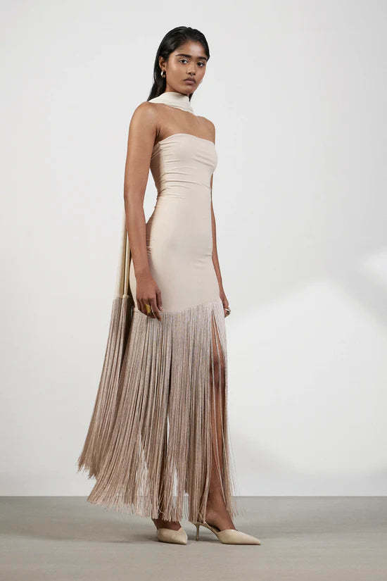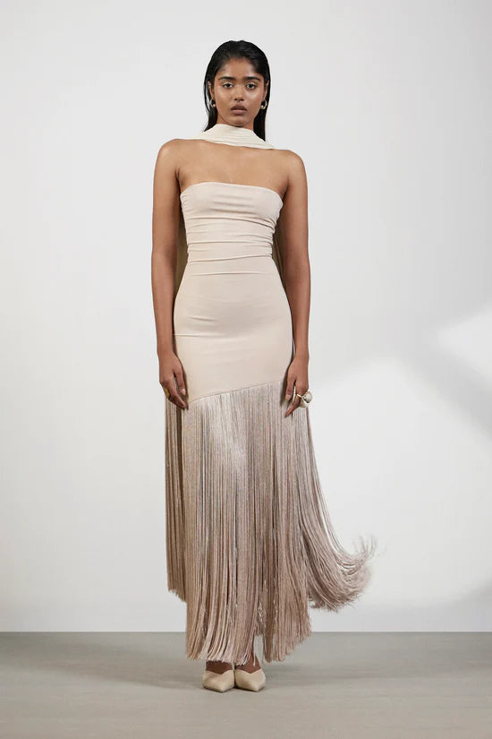 This neutral-toned strapless maxi dress features a sculpting fit and full-length fringe from thigh to hem. Comes with a matching fringe scarf for an elevated, runway-inspired finish.