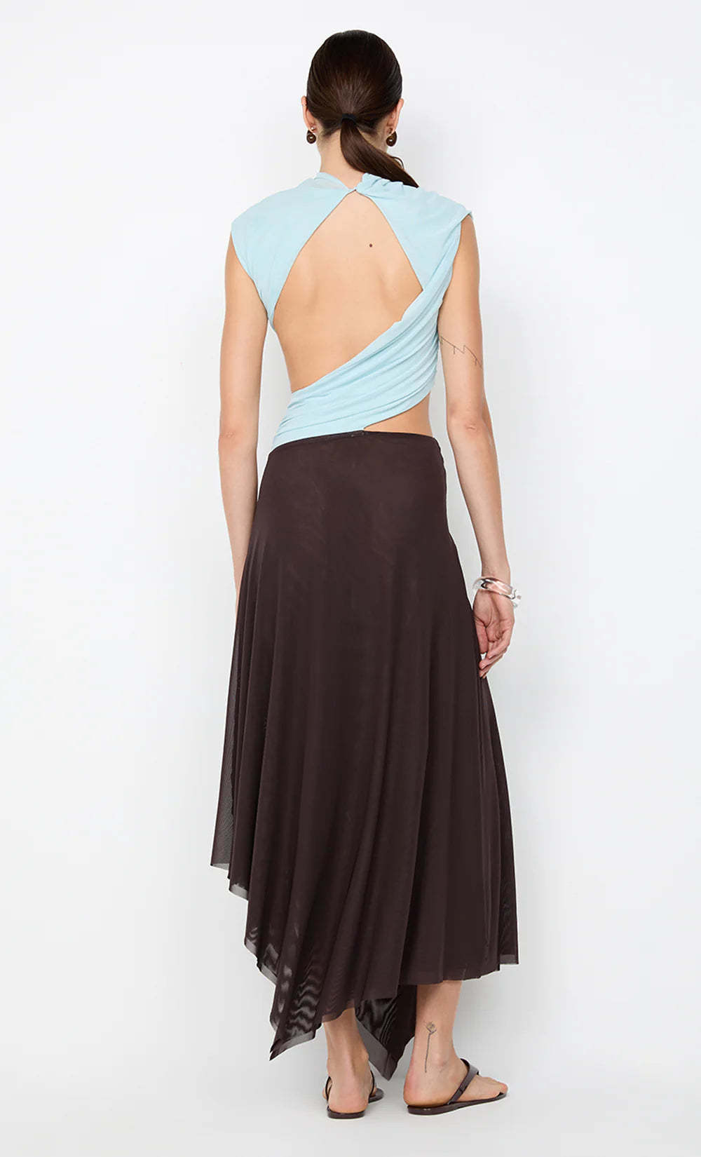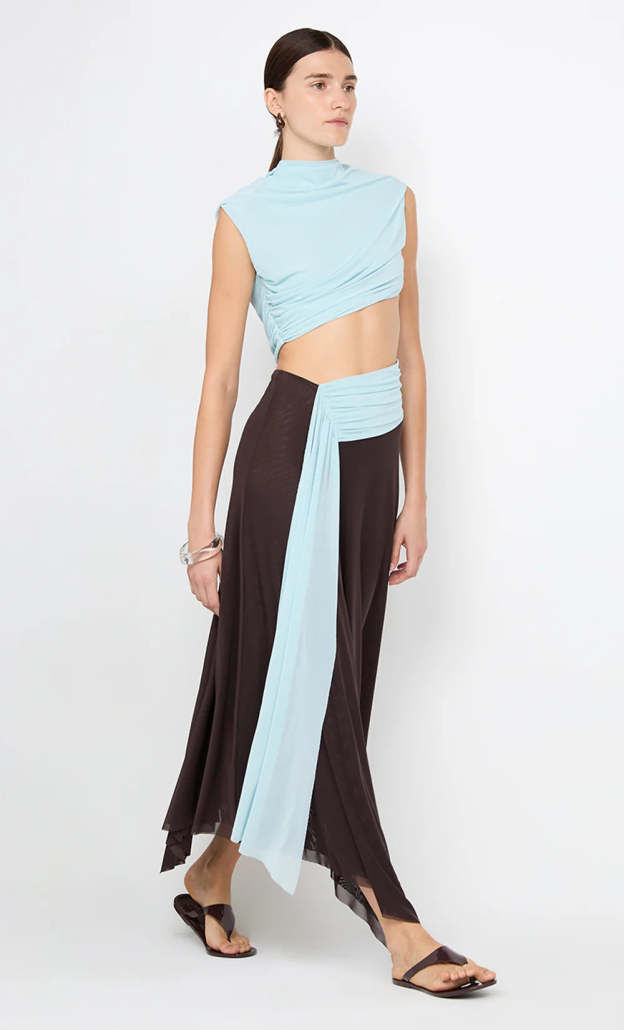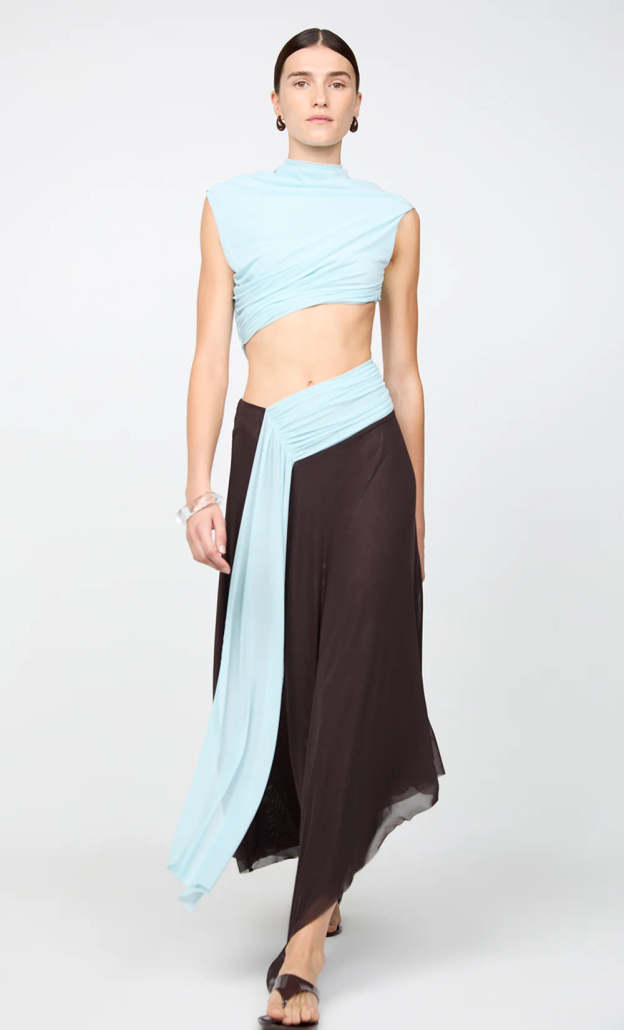This light blue illusion midi dress features a mock neck sleeveless top with waist cut-out detailing, seamlessly transitioning into a brown mesh skirt. Designed to look like a two-piece, it delivers a modern, sculpted silhouette.