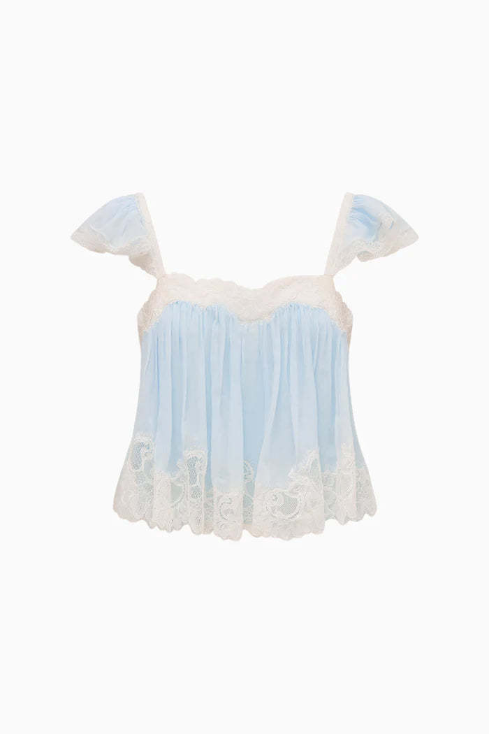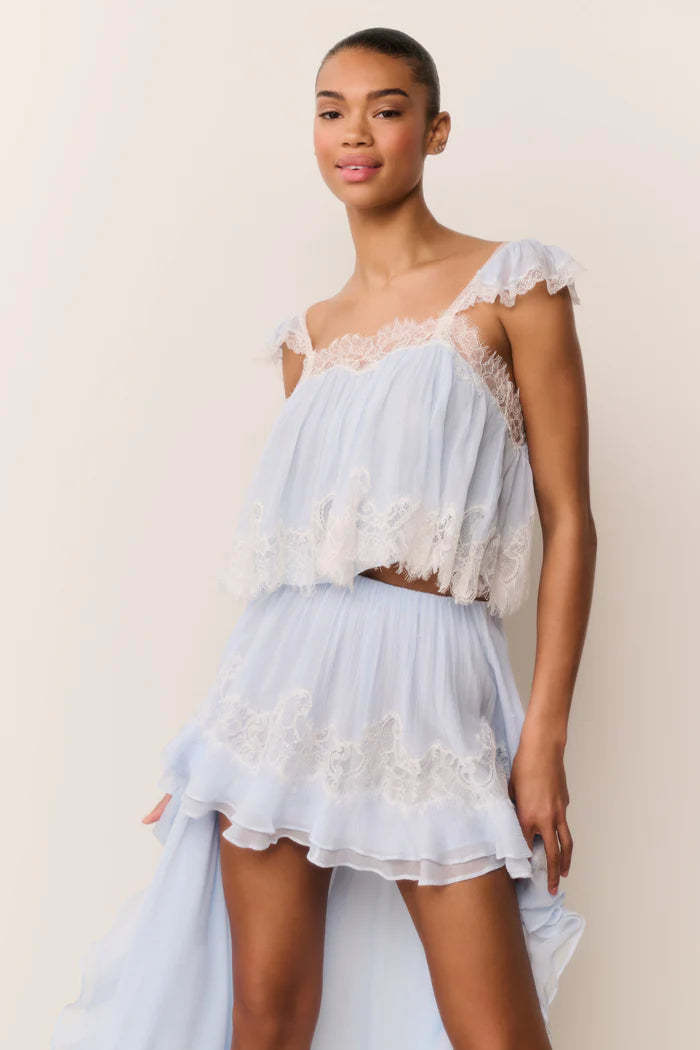 This sky blue chiffon crop top features soft ruffle shoulders with white lace trim along the neckline, bodice, and hem. Light and airy, it brings a dreamy fairy-core vibe to summer styling.