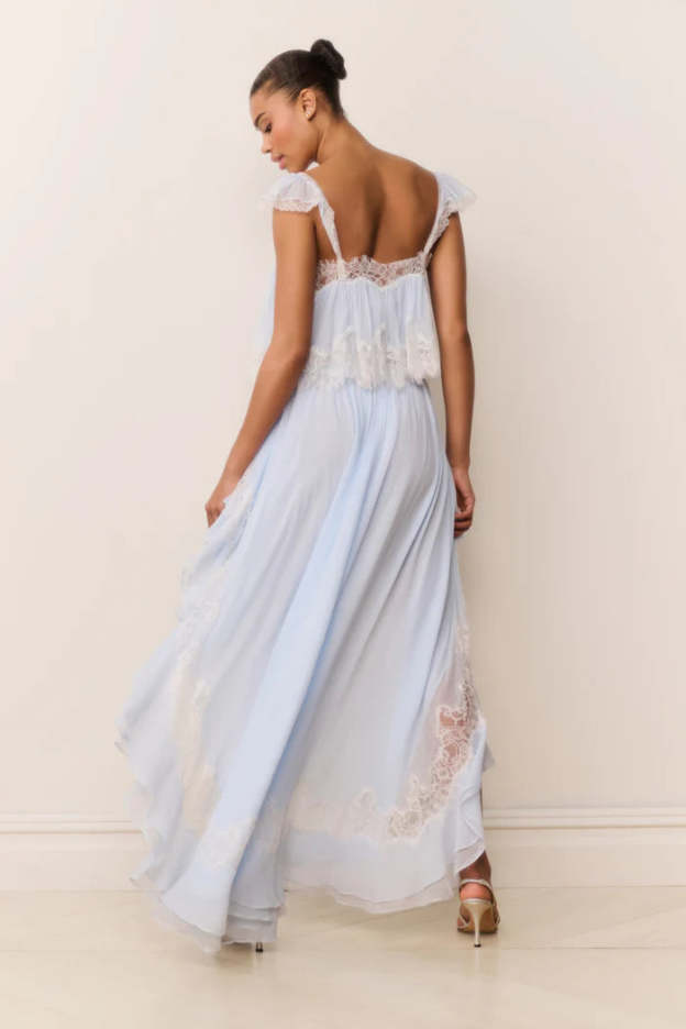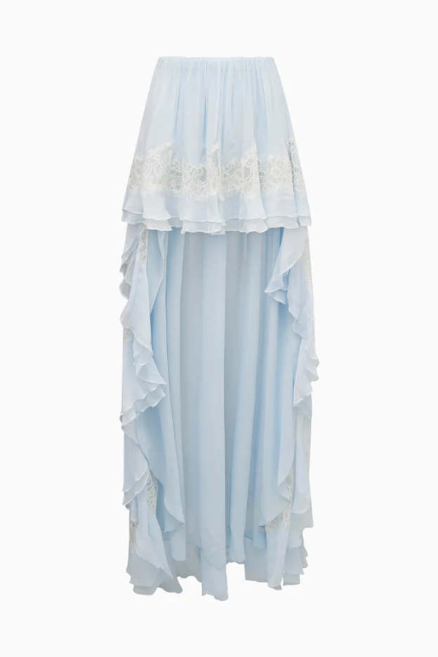 This matching chiffon skirt features a high-low hem with delicate white lace trim. Flowing movement and soft layers create an ethereal silhouette—perfect worn alone or as a complete fairy-inspired set.