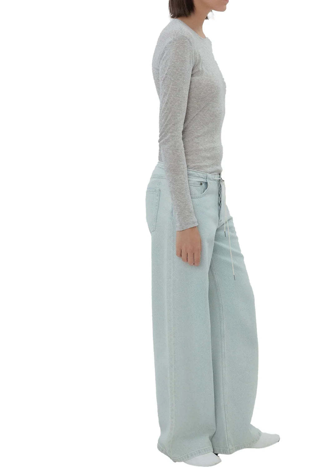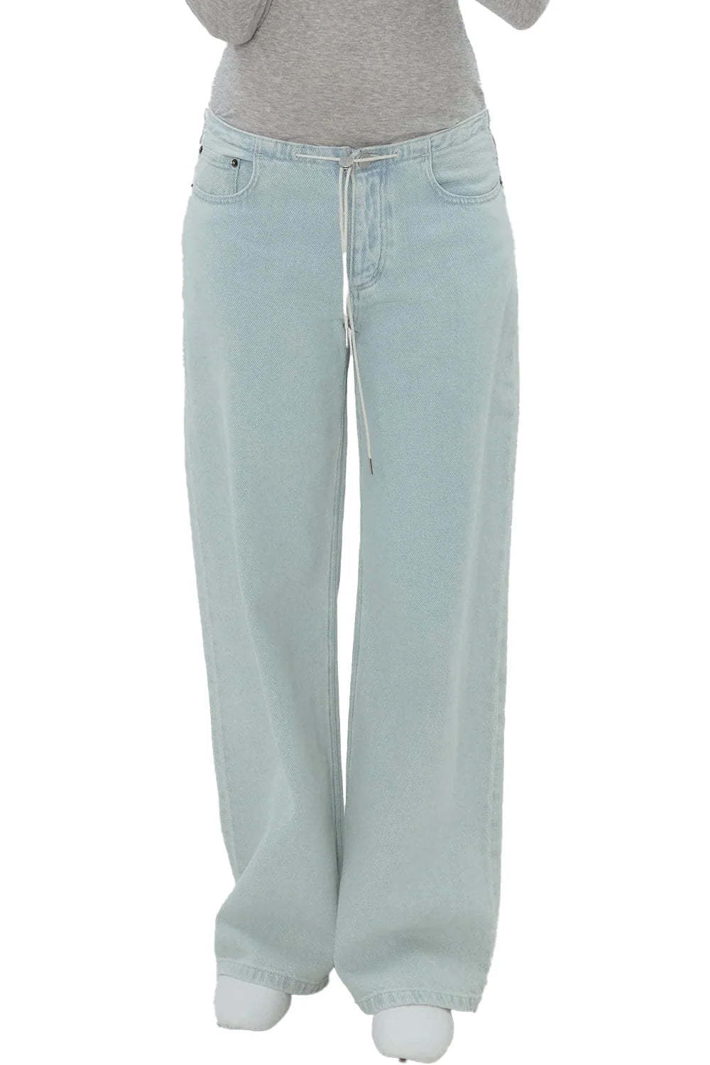 Comfort meets effortless style. These washed light-blue wide-leg jeans feature an elastic waistband with an adjustable drawstring—perfect for relaxed days with a chic edge.