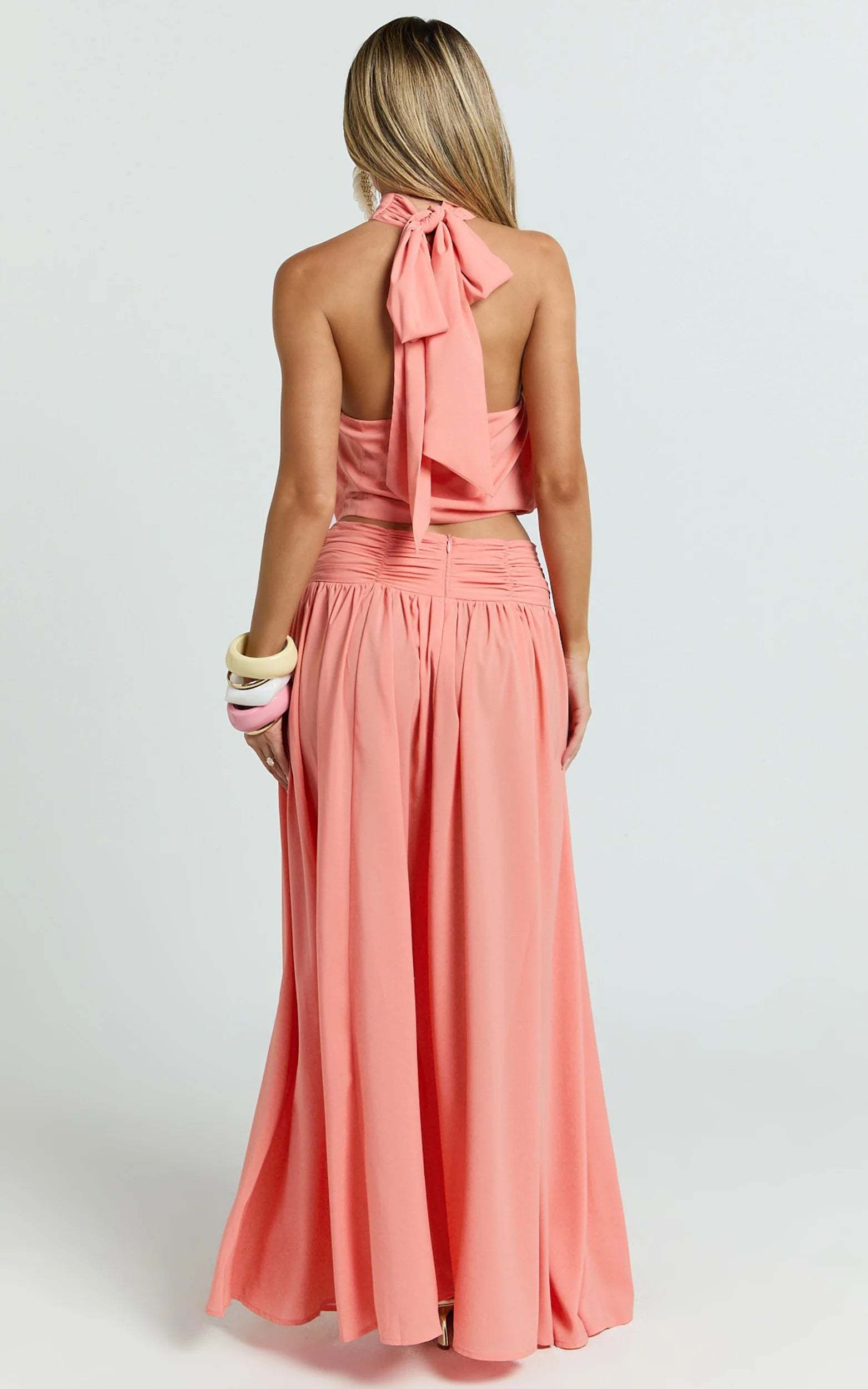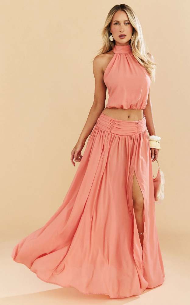 A vibrant watermelon-red halter crop top made from lightweight chiffon. Featuring an open-back design that feels breezy, playful, and perfect for summer styling.