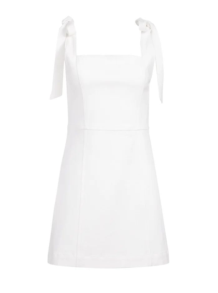 A sweet graduation-ready mini dress featuring a fitted waist, A-line silhouette, and delicate bow accents on the shoulder straps. Clean, youthful, and perfectly celebratory.
